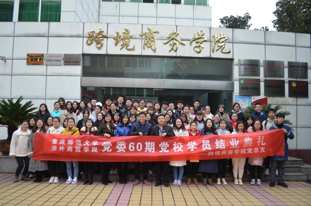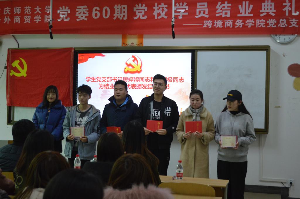 为深入学习贯彻落实党的十九大及相关会议精神,深学笃用习近平新时代中国特色社会主义思想,把党委60期党校关于党的路线、方针、政策;党的宗旨、党性、党纪;党员的权利、义务及其先进性、纯洁性和堡垒性,落实、落细;进一步加强学院入党积极分子的教育考察和培养,激发广大入党积极分子在党爱党、在党言党,旗帜鲜明跟党走的决心,学院党总支于2019年3月7日12:30,7203教室举办党委60期党校学员结业典礼。学院党总支书记任伟同志、组织员帅爱军同志及学生党支部廖婷婷、王玥极书记出席。