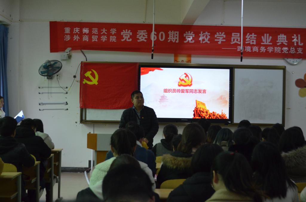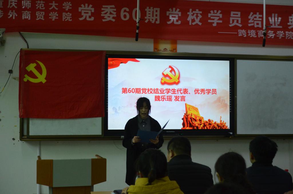结业典礼在雄壮的歌声中拉开帷幕。首先由学院党总支书记任伟同志致辞并宣读《重师商院党委60期党校跨境商务学院结业名单》及优秀学员名单。任书记勉励结业学员把党校学习内容内化于心、外化于行、固化于规,用实际行动争取早日入党。