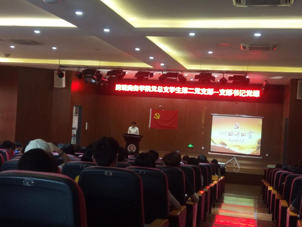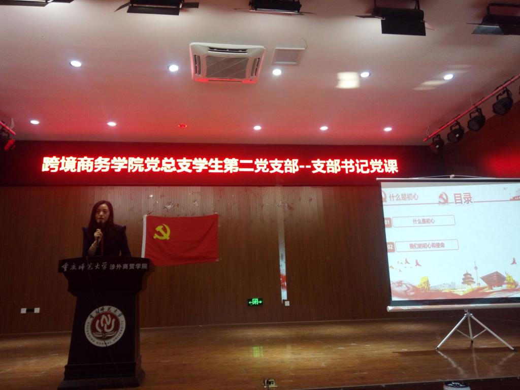 为提高我院学子思想政治觉悟,发挥学生党员先锋模范带头作用,增强我院党总支活力,2019年4月25日(周四)18点,在铜梁校区学术报告厅,举办“跨境商务学院党总支学生第二党支部——支部书记讲党课”活动。党总支组织员帅爱军同志、学生二支部书记王玥极同志、学院铜梁校区负责人易川、辅导员王兆彬同志、学生党员代表以及大一学生干部等300余人参与。