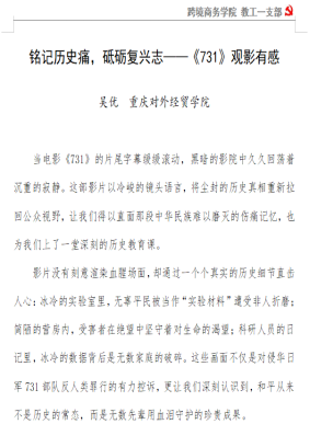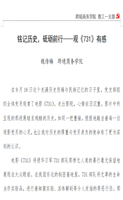 【本网讯】9月18日,为深刻铭记历史苦难、传承爱国主义精神,引导支部党员筑牢理想信念、践行育人使命,跨境商务学院教工一支部开展主题党日,通过组织党员集中观看影片《731》,以历史为镜鉴,接受深刻的党性教育与精神洗礼。
