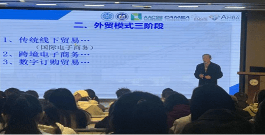 其次,讲座深入解析了外贸模式的三阶段升级路径,展现了中国对外贸易在交易方式上的持续突破:第一阶段以传统线下对接为主,后期逐步融入国际电子商务元素;第二阶段迈入跨境电子商务时代,依托电商平台实现跨境商品与服务的高效流通;第三阶段则发展至 “数字订购贸易” 阶段,交易全程依托数字渠道完成,标志着中国外贸正式进入数字化转型的关键时期,也成为当前外贸发展的核心方向。
