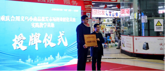 活动期间,姜维老师代表团队参加了校企共建合川区电商直播孵化基地的签约仪式。此次签约进一步推动了校企合作的深化,搭建了区域电商直播人才培养平台,标志着双方在促进区域电商直播产业发展方面迈出了重要一步。同时,王德印书记还代表学院为重庆合川义乌小商品批发市场创业孵化基地授予了“实践教学基地”牌匾,进一步扩大了产学研合作的深度,强化了校企协同育人的长效机制。