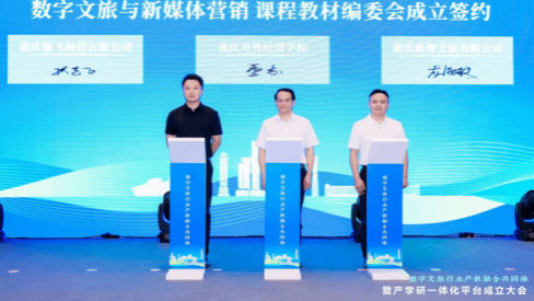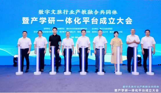【本网讯】7月14日,由重庆市教育委员会、重庆市文化和旅游发展委员会指导,重庆文化旅游集团主办,重庆新智文旅有限公司、重庆楠飞科技有限公司、重庆对外经贸学院等单位联合承办的“数字文旅行业产教融合共同体暨产学研一体化平台成立大会”在重庆江北区隆重举行。我校作为承办单位之一,由执行校长董志教授带队,学校校企合作服务中心负责人成洪波,跨境商务学院院长赵逖,跨境商务学院党总支副书记王德印陪同,全程参与了此次盛会。