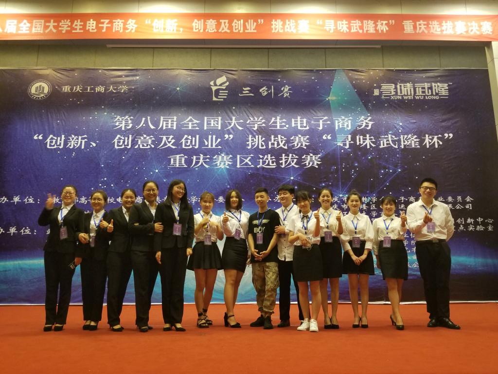 第八届全国大学生电子商务“创新、创意及创业”挑战赛“寻味武隆杯”重庆赛区决赛于2018 年5月20日在重庆工商大学举办。 此次比赛共有 19 所高校参赛,共计 1178 支团队在全国组委会官网注册并通过审核。大赛经过校级赛选拔,共 316 支团队入围市赛,市赛通讯评审选拔出 100 支团队参加市赛现场赛。经过一天激烈的预赛和决赛,我校跨境商务学院入围市赛现场赛的4支团队在比赛中获得4项大奖,包括一等奖2项,二等奖2项。