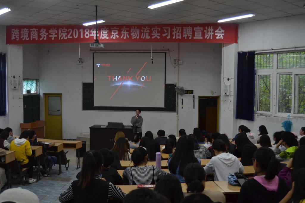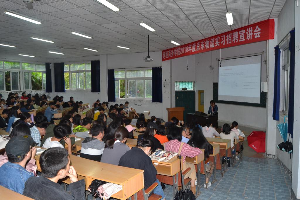 重庆京东物流仓储负责人刘欢老师从京东发展历程、企业文化、人事制度、岗位需求、招聘要求和实习薪酬待遇等方面做了详细宣讲。随后,2014级物流管理专业毕业生邱勤同学从京东的员工关怀、同学情谊、工作责任和团队力量等方面进行了实习就业分享;最后,学生就实习相关问题提问和答疑,并在现场进行网络报名。