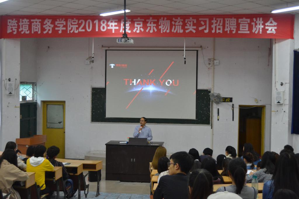 2018年9月27日中午,跨境商务学院2018年京东物流实习招聘宣讲会在学校2101教室隆重举行。跨境商务学院院长李安平教授,党总支书记任伟同志,重庆京东物流仓储人事负责人刘欢老师,物流管理教研室全体教师,2014级物流管理专业毕业生现京东物流员工邱勤以及逾200名应届毕业生参加了此次宣讲会。