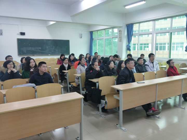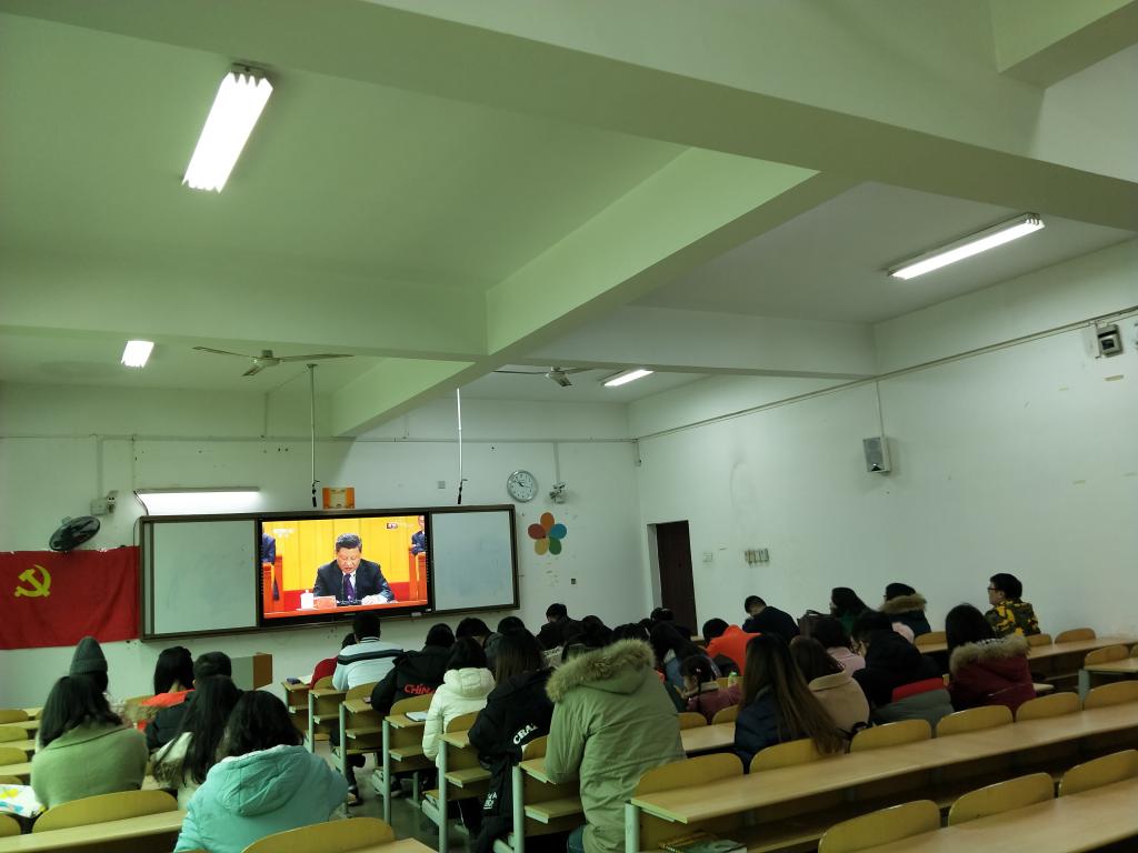 跨境商务学院全体师生热切关注,为及时了解大会盛况,学习会议精神,学院党总支组织党政领导班子、教师、学生党员,及部分学生干部约百余人第一时间于2018年12月18日上午10点在7教302室收听收看大会直播盛况。