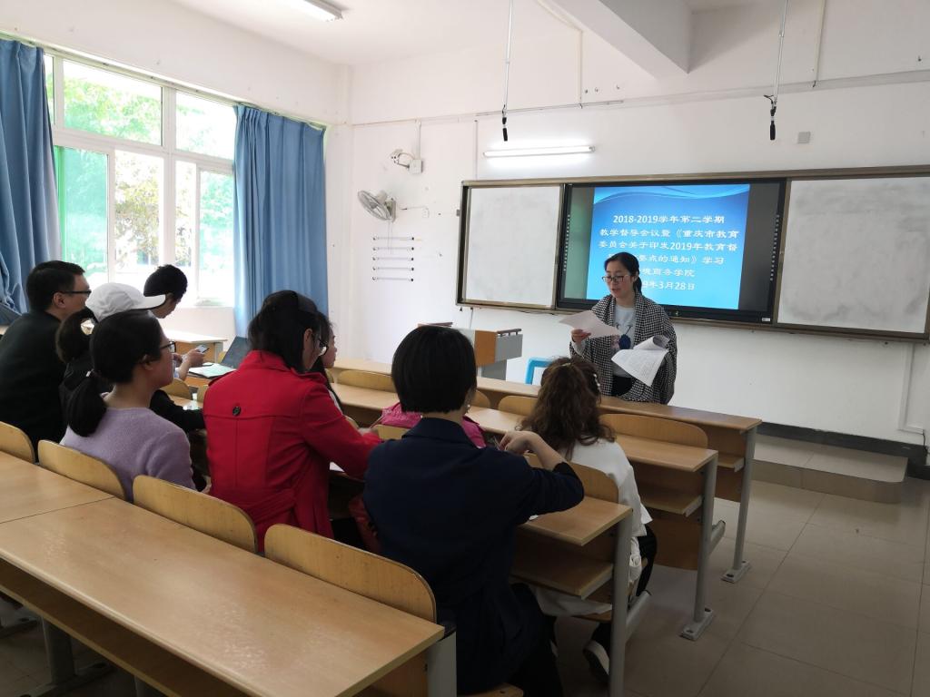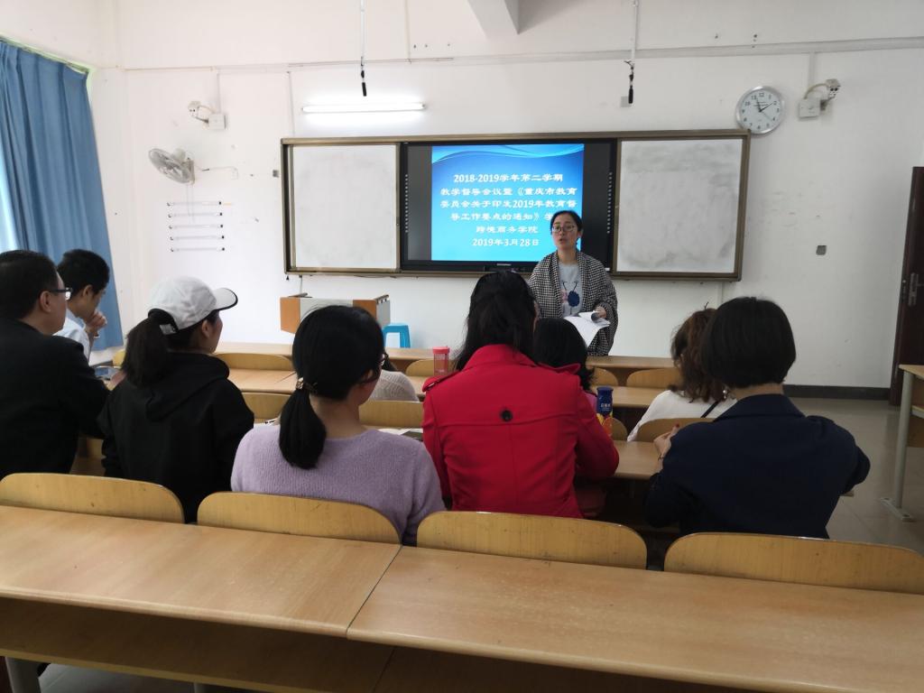 本次会议由学院教学与科研办公室主任杨桢主持,杨桢强调根据《重庆市教育委员会关于印发2019年教育督导工作要点的通知》的内容,本期教学督导工作要坚持以习近平新时代中国特色社会主义思想为指引,全面贯彻落实党的十九大精神和全国、全市教育大会精神,发挥教学督导工作的作用,完善教育教学常规督导反馈机制,加强督导工作的信息化工作,增强全体教师的规范意识,提高教育教学管理的针对性和实效性,保证教育教学工作的良性运行,不断提升教育教学管理质量,并根据本期教学督导方案,完成本期教学督导工作。与会中各督导员围绕前期教育教学工作中的问题进行了沟通交流。