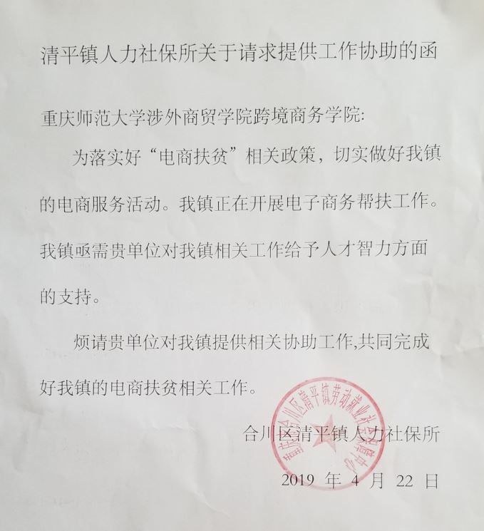 合川区清平镇人力社保所关于请求提供工作协助邀请函
