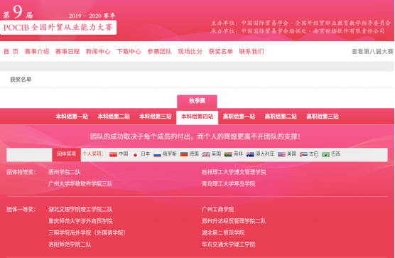 2019年11月26日上午10时,由中国国际贸易学会、全国外经贸职业教育教学指导委员会主办的“第九届POCIB全国外贸从业能力大赛(秋季赛)”圆满结束。我院参赛队伍在甘元玲、雷勤颖两位老师的带领和指导下,荣获全国“团体一等奖”,共有17 名选手荣获个人奖项。