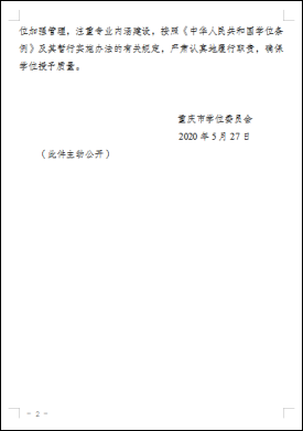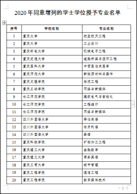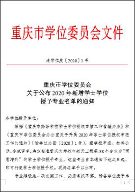 2020年5月28日,重庆市学位委员会印发了《重庆市学位委员会关于公布2020年新增学士学位授予专业名单的通知》(渝学位发〔2020〕1号),经申报、公示、审核等程序,决定批准我校数字媒体技术、保险学、音乐表演专业为“同意增列”的学士学位授予专业,即日起可行使学士学位授予权。