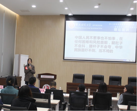 蒋思维老师用“中国人民不惹事也不怕事,在任何困难和风险面前,腿肚子不会抖,腰杆子不会弯,中华民族是吓不倒、压不垮的”这一理论主题向我们传达了关于国家、关于民族、关于个人安危的使命,以逻辑清晰,又能入脑入心的宣讲方式紧紧围绕“说思想”“说政策”“说心理”“说学习”来砥砺家国情怀,激发使命担当,把伟大的抗美援朝精神必须永续传承、世代发扬,来坚定信念书写新中国人民的自尊自信;把我们辅导员工作中要永葆“闯”的精神、“创”的劲头、“干”的作风“燃”出团队协作。