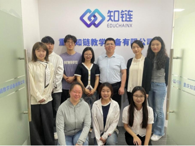 图为 师生们与重庆知链教学设备有限公司负责人合照