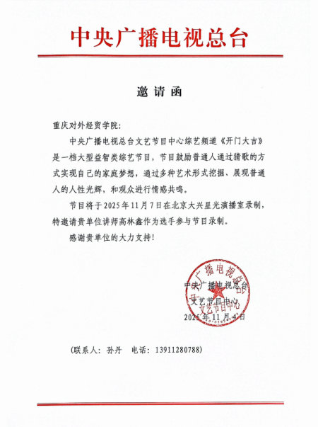 近日,我院电子商务专业教师高林鑫收到中央广播电视总台文艺节目中心综艺频道《开门大吉》节目组的正式邀请函,邀请她于2025年11月7日赴北京大兴星光演播室参与节目录制。此次受邀参与中央广播电视总台节目录制,是高林鑫老师个人风采的重要展示,也是我院老师主动服务地方发展的生动缩影。未来,我院将继续支持教师发挥专业优势与个人特长,在实践育人与社会服务中勇担使命,贡献更多教育力量!