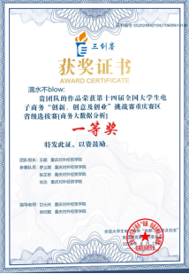 本次赛事激烈纷呈,大赛历时9个月,学生团队获得了较好的成绩。“滴水不BLOW”和“G无限”团队,应用专业知识,大胆实践,斩获重庆赛区“商务大数据分析”赛道一等奖;“国奖我们来了2”团队在“跨境电商—亚马逊”赛道获得二等奖;“搞事业就对”团队在“数据分析与营销”赛道获得二等奖;好事花生生队在传统赛道获得二等奖。